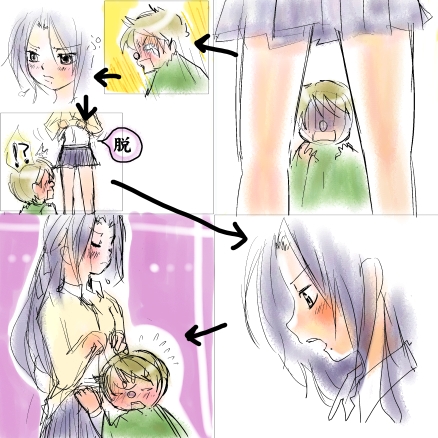 (や、コメもらったりして嬉しくて、何かしようかしらと企んでたんですが、 継続的に語るのは、難しいので…、今日だけ、語ってみます。) 色々妄想過多です。ご注意です。興味の無い方は軽くスルーでお願い致します。 ★子ゴリョが、おやつを食べていたら、口元にあんこが付いてしまって 子エビスが「あっ、ゴリョーさま…。」とハンカチで拭き拭きする図は可愛いと思うです。 子エビ五バンザイ!! ★子ゴリョが女装気味で、むっす~と睨み顔なのも可愛いと思うです。 かわうい。 ★ でも大人若も好きです。しら~っとした若にビビルエビスとか好きです。 ★↑と被るかもですが、ぶっすーとしたゴリョ様好きです。 で、笑顔のエビスも外せない。妄想でも良い(?)。 …妄想ですけど、上絵のぶっすーとしたゴリョ様が このにっこりエビスを思い出しているとしたら…モーレツに可愛いと思う。 ----------------------------------------------------------------- あと… ★いKIものがかりの「ひなげし」は、私的にエビ五ソングです。 ★なつかWりみさんの「きせきのうた」も、私的に相当エビ五ソングです。 あと… ★Nんどろいどをリスペクトしたい気持ちだけはあります。 だって、和風のお部屋セットとかいうセットがあるんですもの。 ちいさい和室にちいさいゴリョ様座らせたら、絶対愛らしいよ。 ちいさいエビシュも一緒に飾りたいよう、きっと可愛い。 でも、すごい技術がいるんだろうなぁ…。 ----------------------------------------------------------------- ★あと… おな五様が、高校に潜入。エビシュとすごいバカップル…なんてネタも 自分ですでにキツイけど、好きです。絵は一枚に集約(?)してみたので 文章読んで「キッツイ!;;」って方は、絵をクリックしないで下さいませ。 ほんとに相当きもいのでご注意です…。 場面としては、高校に潜入するおなご若とエビシュ。 ①おな五さまは、女子高生の制服を着てみたかったで、 試着してエビシュにどーんと見せます。 ②だけどエビシュは 「ダダダ!そんな短いスカート、絶対ダメですーー!!!」 と青くなります。 ぷーっと膨れるおな五さま。にわかに着ているカーディガンを ぐいっとたくしあげるので、エビシュ「!?」とビビリます。 ③標準の制服のスカートの折り込んで短くしていただけなので、 くるくる戻せば、スカートを長く出来るのです。 「…じゃあ、どんな長さなら良いんだ。お前が直せばいいだろ」 ④「ひ、人が来たら、俺、ケーサツ呼ばれるんじゃ…」とビビリつつ、 スカートを長く直すエビシュ萌。 一応さらにつづきがあって、標準の丈にしても「まだ短い…」とエビス。 「は、袴位の長さが良いです~」と言うんですが、おな五さまとしては 今風のスカートを穿いてる所をエビスに見せたい乙女心もあったので、 腹がたって、ブッチン!と(?)怒ってしまう…という、バカップルネタでした。 ----------------------------------------------------------------- ----------------------------------------------------------------- なんか超楽しかったです~。やっぱりエビ五はサイコーだ。 PR おえかき掲示板の版権お題、無事終了しましたね。楽しみましたー! 皆さんの愛いっぱいの魔法律絵にニヤニヤしました。 ↓おまけ。若エビ絵の描き込み前の絵。 描き込み前の絵も好きです、さっぱりしてて。 ほんとはボスや梅や、ビコ・エンチュ・ヨイチ… 描きたいキャラは沢山居たのですが、時間と気力不足で…。 しかも、久しぶりにちゃんと絵を描こうとしたら、 デッサン等が相当狂ってて…相当恥ずかしいです。 あと本家って、すごいテンパるのが自分で分かるです…。 それと、自分がロリショタ好きなのを改めて実感…。 色んなキャラを描くのは諦めて、ゴリョ様に的を絞ってみたのですが なんだか本家に出しにくい絵ばかりが描きたい私な訳で…笑。 ロリ若とか。 ちょっとジロリ目若。 髪下ろしてるおなご風若とか。 これ「えーびーすっ。」って言ってると思う(妄想)。 あと、「はぅ!?」ってなってるエビスとか? このエビスは問題なさそうだけどにゃ…。 ともあれ、久々にエビ五と魔法律と そのファンの方々の愛に触れたら、相当楽しかったです。幸せでした。 だいすき。