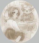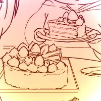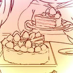 私もケーキ食べたいしでケーキ絵… 【妄想スタート…】 休みの日、エビスは甘い物がムショウに食べたくなりました。 (金はあるんだし…、丸まま買ったって良いよな!)と なんとホールケーキを買ってきます。部屋でこっそり食う気です。 ところが、部屋に戻る途中でゴリョ様に発見されます。 ゴリョ様に発見されてみると、一人でワンホール食べようだなんて やたらと恥ずかしい気がしてきました。 結局、ゴリョ様のおやつにと思って買ってきたのだと誤魔化して (でも、ゴリョ様には一人で食べる気だったとバレている様でした) 結局は部屋で二人で分けて食べる事にしました。 そして 「はい、ゴリョー様」とか言って切り分けてる所に 女中さんが「エビスさん、居ますか?」とやって来て エビスがドアの所に行って受け答えしてる時にドアの隙間から ゴリョ様がちょこんと座ってる所を目撃されると可愛い。 エビ若倶楽部(私の妄想内で、女中さん達の間にある同好会)大喜びです。 ちなみにエビ若倶楽部は、若様とエビスの可愛らしさを発見しては きゃあ可愛い~♪と盛り上がる倶楽部です。 普通に発見されても可愛いけど、覗き見されても可愛いかも。 「…? ゴリョーさま? どうかされましたか?」 「…人の気配がする…」 とか。 ----------------------------------------------------------------- さて、うっかり夜更かししてしまいました。寝ます。 時間と体力と精神力がお金で買えたら良いのになぁ…。 ----------------------------------------------------------------- 拍手ぽちっとして下さった方ありがとうございます~。