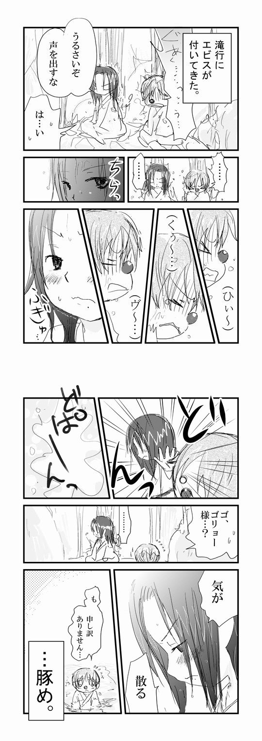 先日小さな滝を見て以来、 「子ゴリョ様が滝に打たれてたら素敵」妄想がモクモク。 ★明日は夏コミなのですね…?行かれる方、楽しんできて下さい。 暑さに気をつけて…!水分沢山とって、無理しないで下さいね。 それから、現在、原稿かかれている方、頑張って下さいです~。 ★今日から仕事でした。朝、憂鬱で…すごく気分が暗くなり 「エビスみたいなのを、ぎゅうってしたい…」と ふらふらした気分で会社に行きました。 会社の方は、大した問題は起きなかったので良かったです。 気分も朝よりは、ぐっと楽になりました。 でもせっかくなので(?)、エビスぎゅうっと若妄想をしました。 (弱い若が嫌な方はスルーで…) (以下、反転文字) 若が不安に耐え切れなくてエビスに 力強くぎゅうって抱きついたら エビスは黙っていなくてはいけません。 何度か(抱きしめた方がいいのかな…)と思い 抱きしめようとして、怒りを買います。若わがまま。 たぶん若は、そういう時はエビスに ただ、じっとしていて欲しいのかも。 でも若が、辛い時以外に、ぽふっと甘えて来た時は、 抱きしめたり頭撫でるのは有効です。 何もしないで欲しいのか、そうでないのかを 見極めるまでは結構大変な感じです。 聞く話によるとウサギも、そういう所があったりするそうですね。 「膝に乗ってきたので撫でたら(ウサギが)怒った」とか… 拍手ぽちっとして下さった方、ありがとうございました。