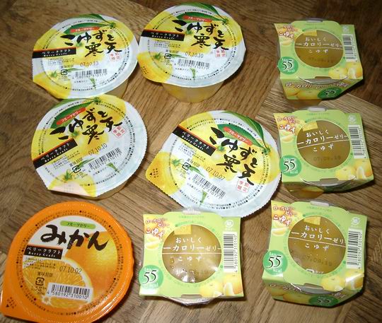 神戸の…ほんたかさごや…。素敵。 最近、柚子のお菓子ブームです。 先日、柚子ゼリーを食べたら、 さっぱりしていて美味しかったので、ブーム到来。 今日は、こゆずゼリー8個とみかんゼリー1個買ってきました。 最初はみかんゼリー1個のつもりだったんですけど、 柚子ゼリーに【期間限定】って書いてあって…つい。 並べると素敵映像。 あと、先日買い逃した、柚子あんの 水饅頭みたいなのも買えたし…よっしゃ。 あと、今週はギョウザ週間です。(普通はうなぎです) 惣菜のギョウザは今日食べる分で… 他に【ミヨシノのギョウザ】と【キブンの水ギョウザ】と 【ニチハムのにら焼餅】を買ってきたもんね。全部今週中に食べるもんね。