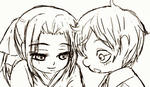 というバトンを受け取りました~。何枚かずつアップしたいです。 全部で10種類の絵柄が指定されてるのですが…セレクトがすごいです。 「目をつぶって描く」とか「利き手と逆で」とかあるの…笑。 で、ほんとは順番があって、その通りに描いて行くのが 良いのだろうけど…順番どおりだと私、後半に萎える 可能性が高いので、順番を入れ替えてしまいました。申し訳ない。 ※あと「両手で描く」は、ほんとに両手でペン握って描いてみたりしました。 ほんとは4枚描く事になるらしいのです。あれかな…、 右手で右向き、左向き、左手で右向き、左向き?そうかもしれないと思いつつ、 それは疲れそうなので、気付かなかった方向で…;; ①いつもの絵柄で お風呂から上がって、髪乾ききってない状態で エビスの所にやってくる子若。きゅん。そんな妄想絵。 いつもの私の絵は大体こんな感じですよね。 ⑩両手で描く やはり両手で持つと、利き手が主導権を握ってしまいました。 「利き手と逆」は、そりゃあもうひどい事になるのでお楽しみ(?)に。 あと、さっくり若で描き始めてますが、最初はエビスも迷ったのです。 というか、まだ迷ってる…エビスでもやってみようか…気力のある時に…