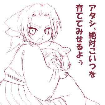 おバトンは、どうしよかな~と考えるのが楽しいですよね。 ------------------------------------------------------------------ 今、エビスが女性にデレ~っとして、それにゴリョ様が ひどく立腹&傷心な漫画のネーム描いてたのですが…。 ゴリョ様を悲しませるエビスを描くのが妙に難しいっていうか…、 ていうか、…難しい(日本語変)。やはり二人はラブラブなのが良いよ。 そんな訳で(?)、時々止まったりしつつも、ちまちま描いてます。 ゴリョ様がエビスを好き過ぎて、苦手な方は苦手かもなので アップする時は注意書きがんばるです。ガッツ。 以前、子若が子エビスに怒る嫉妬漫画の構想があったのだけど、 それもなんだか切なくて…。さわりだけ紹介してみますと…。 【以下、妄想です。苦手な方はご注意下さい】 ----------------------------------------------------------------- 子エビスに優しくしてくれる女中のおばさんが居て まるで自分の子供かの様に接してくれて エビスはそのおばさんを好きになって それに気付いた若は、なんだか面白くない訳です。 ある日、1人遠出した子エビスはおみやげに 子若に、綺麗な模様の匂い袋とか買ってくるんですが、 実はそのおばさんにも同じ物を買ってきていて、 若はそれを知って面白くなくて、貰った匂い袋を捨てちゃって エビスはエビスで、捨てられた匂い袋見ちゃってガーンとか… ある冬の日に、エビスがマフラーを駄目にしてしまって おばさんが 「家に使ってないマフラーがあるから 明日持ってきてあげるわね」と言うのを聞いたゴリョ様は面白くなく… で、自分が先にエビスにマフラーをやったら どうなるだろう…と、タンスに入っていた予備の 自分のマフラーを持ってエビスの部屋に…(どんどん続く)とか ------------------------------------------------------------------ なんだか可愛らしいんだけど、切ない…みたいな感じで 保留になってました。もし、ラスト元気出る感じに昇華できたら 描いてみたいかも。嫉妬してプンプンしてる子若可愛いんだもの。