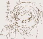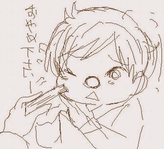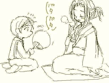 魔法律キャラは、お髭のキャラ多い気がします。お髭人口高し。 あと、エビスの柔らかいほっぺを扇子でつつく図。 ぷに。「おやめ下さい、ごりょーさまぁ」 ----------------------------------------------------------- 今回、おしゃべり白熱して、絵はほとんど描きませんでしたが、 とっても楽しかった。時間あっと言う間でした…。楽しかった! エビスのヘンテコお目目をじぃっと見る若が (ありそうだ~)という話が出てたので、この場に そういう絵を書き下ろそうかと思ったのですが、今は時間ないので また今度の機会に描いてアップしたいです~。 あと、最近自分の中にあったトマス妄想も出せて良かった。 その話とはちょっとバージョンを変えて 今度、トマス先生の妙な愛情漫画描こうと思いました。 よし。って感じです。実は前から「セクハラに迷惑するゴリョ様を エビスがすごく心配する」漫画案があったのですが、 セクハラ表現がギリギリだな…って思って、形に出来てなかったのです。 (その案の相手はトマスじゃなくて、おっさんとかだったんですけど…) でも今回セクハラ抜きで、不快感だけ表現出来そうで、 よし!って感じです。絵茶でおしゃべりする中で方向性が固まった感じ。 ご参加下さった皆様、ありがとうございます~。 あとは描き描き頑張ります~。 ---------------------------------------------------------------- は!昨日、拍手押して下さった方、ありがとうございます~。